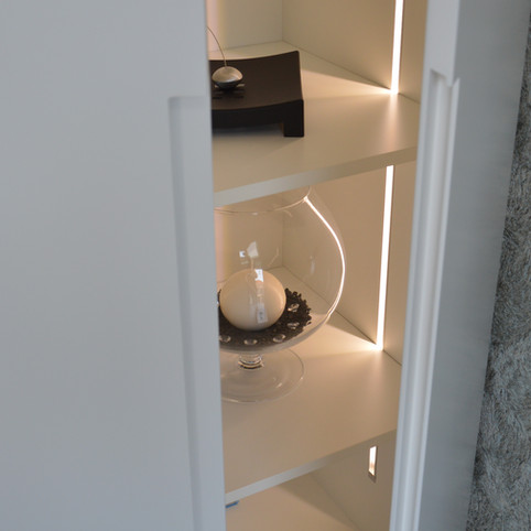 Base bianca opaca con maniglia ricavata nell'anta,top agglomerato marmoreo e dettagli cromati e inox.